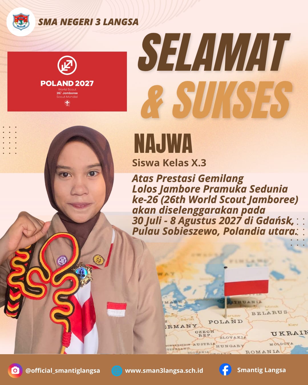 Kabar membanggakan datang dari dunia pendidikan dan kepramukaan di Kota Langsa. Najwa, siswi SMA Negeri 3 Langsa, berhasil menorehkan prestasi gemilang dengan lolos sebagai peserta Jambore Pramuka Sedunia ke-26 (26th World Scout Jamboree) yang akan diselenggarakan pada 30 Juli hingga 8 Agustus 2027 di Gdansk, Pulau Sobieszewo, Polandia.